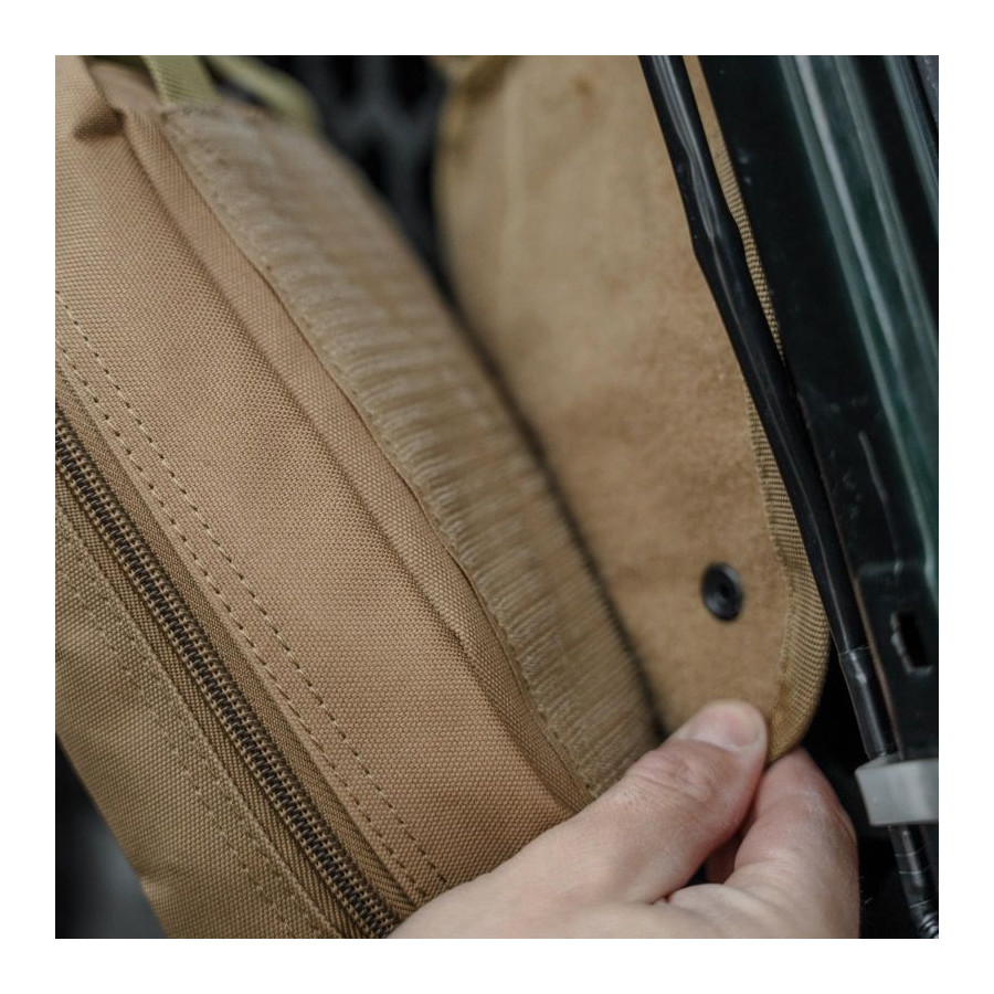 - Doczepiana jest do panelu montażowego za pomocą mocnego rzepu oraz zabezpieczona trokiem z klamrą oraz klapą z zapięciem na rzep.