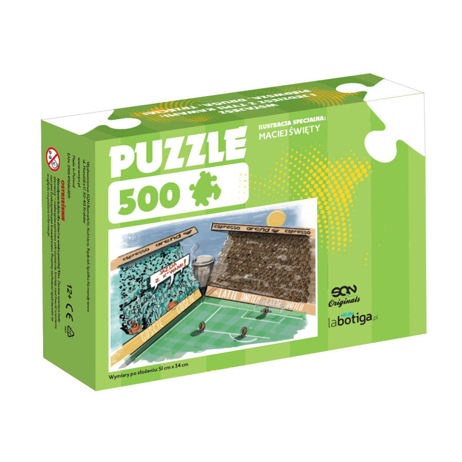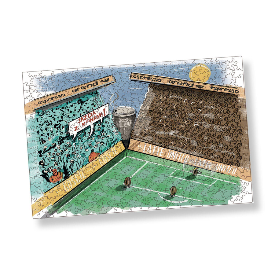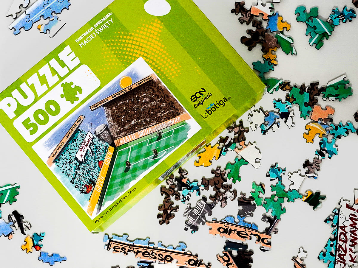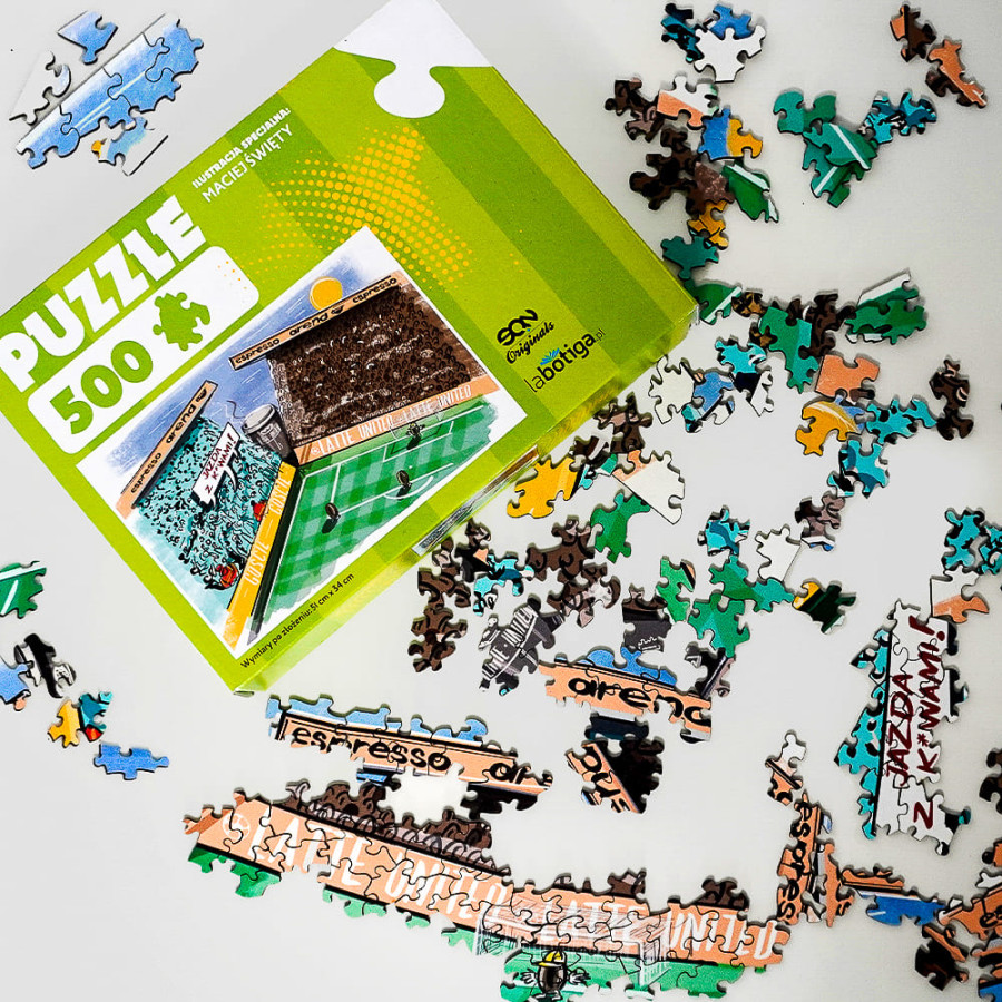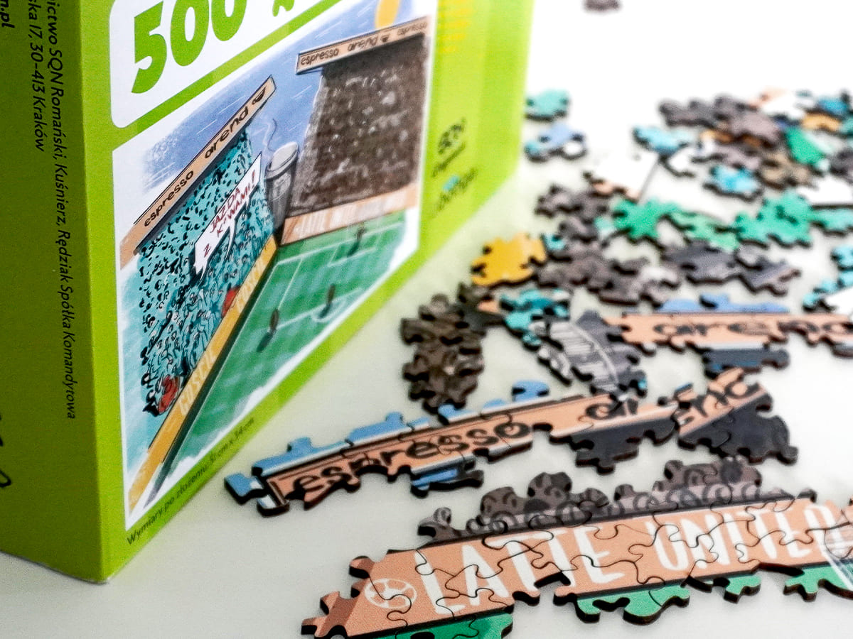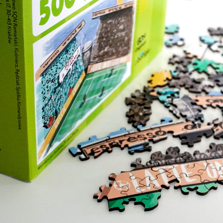 Ta limitowana edycja sportowych drewnianych puzzli ulokuje Waszą sportową pasję na wyższym poziomie. Humorystyczna ilustracja „Jazda z k*wami” prosto ze stadionu zaprasza do kibicowania poprzez układanie i angażowanie się w budowanie odpowiedniego ducha sportu. Nie zabraknie zmagań! Niesztampowe, nieregularne 500 elementów czeka do ułożenia, idealnie sprawdzą się na sportowe spotkanie w gronie pasjonatów albo na czas treningu mentalnego.