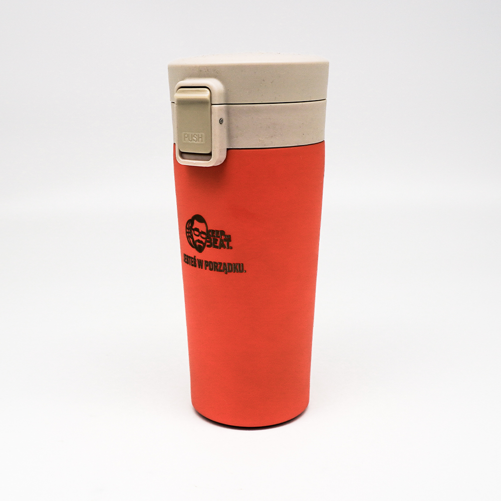 Mini-Kubek termiczny przygotowany dla fanów koszykówki, NBA oraz kanału YouTube: KeepTheBeat.pl. Znakowany napisem oraz logo.