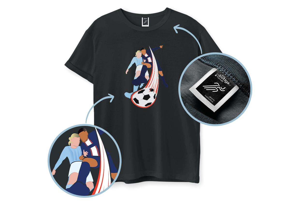 Dopóki piłka jest w grze, na boisku może się wydarzyć wszystko. Graficzne przedstawienie piłkarskiej pasji zostało stworzone przez dedykowanego grafika, znanego z ilustrowania polskich wydarzeń sportowych. Koszulka pochodzi z kolekcji gadżetów sportowych, idealnie pasuje do książek Haaland i Mbappe. Nadruk do serii powstał na potrzeby imitowanej kolekcji dla labotiga.pl