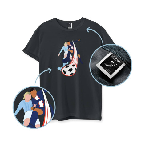 Dopóki piłka jest w grze, na boisku może się wydarzyć wszystko. Graficzne przedstawienie piłkarskiej pasji zostało stworzone przez dedykowanego grafika, znanego z ilustrowania polskich wydarzeń sportowych. Koszulka pochodzi z kolekcji gadżetów sportowych, idealnie pasuje do książek Haaland i Mbappe. Nadruk do serii powstał na potrzeby imitowanej kolekcji dla labotiga.pl
