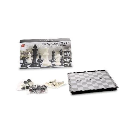 W zestawie: pudełko na figury z nadrukiem planszy, figury do szachów i warcabów, pozostałe informacje: wym. opak. 25,5 x 13 x 4 cm, 6+