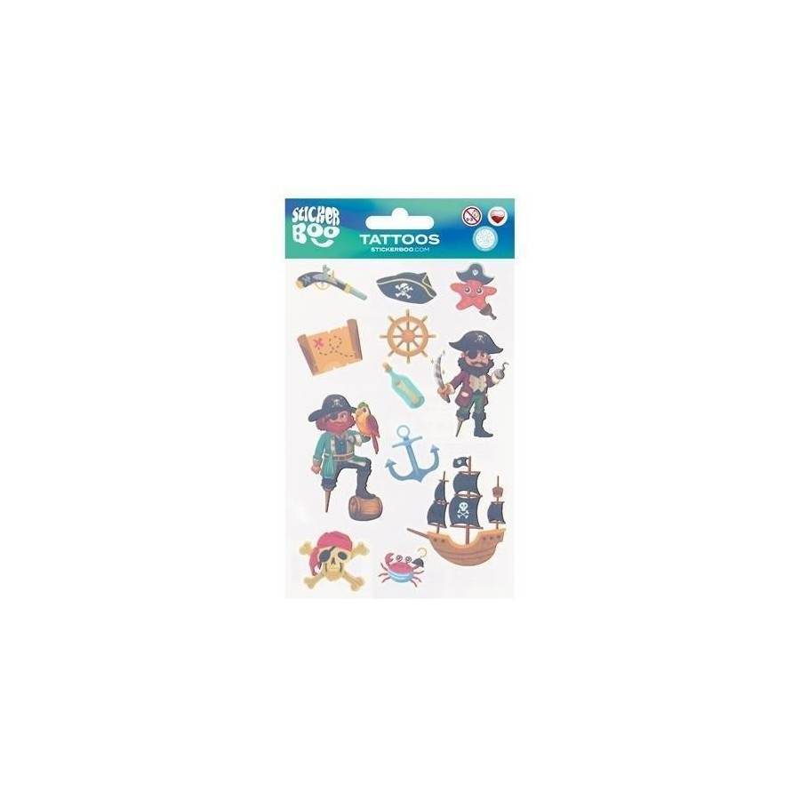 Tatuaże Piraci STICKER BOO z pewnością przypadną do gustu dzieciakom, idealne do zdobienia ciała, dadzą dużo frajdy oraz satysfakcji i wiele możliwości. Łatwe w użyciu! Aby usunąć tatuaż wystarczy tylko użyć oliwki lub mydła.