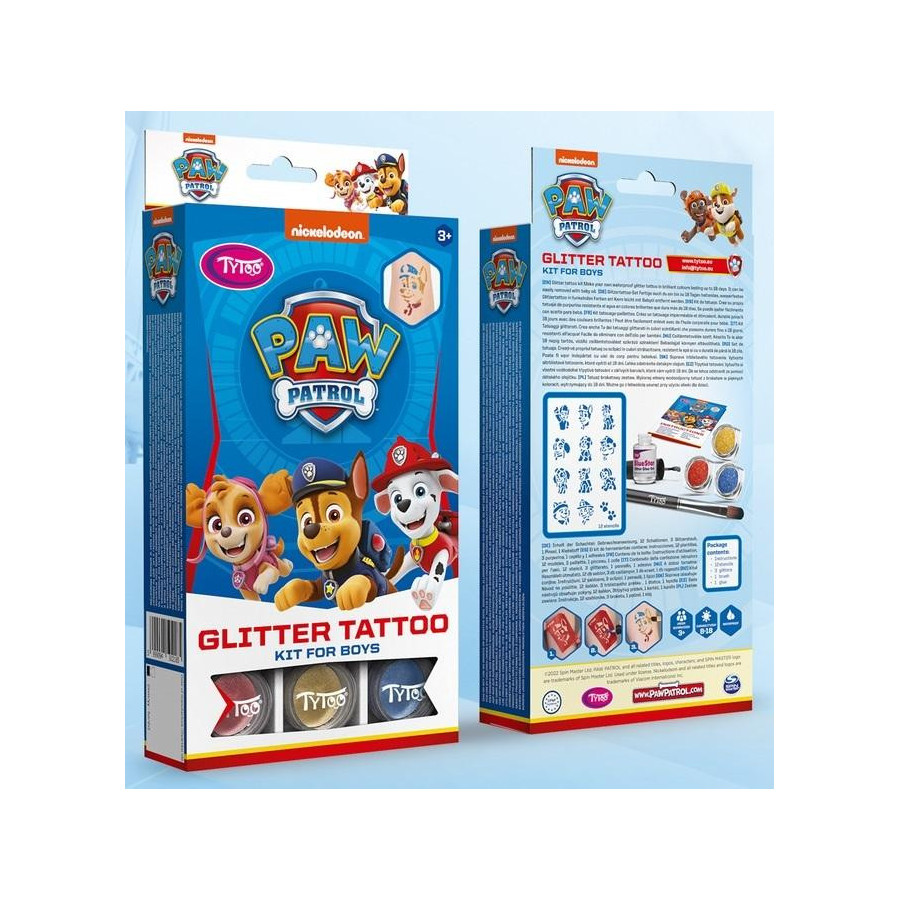 Zestaw zawiera 12 tematycznych szablonów związanych z Psim Patrolem, pędzelek do nakładania brokatu, klej oraz trzy brokaty - czerwony, niebieski i żółty