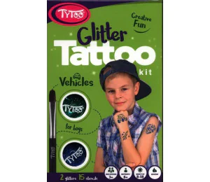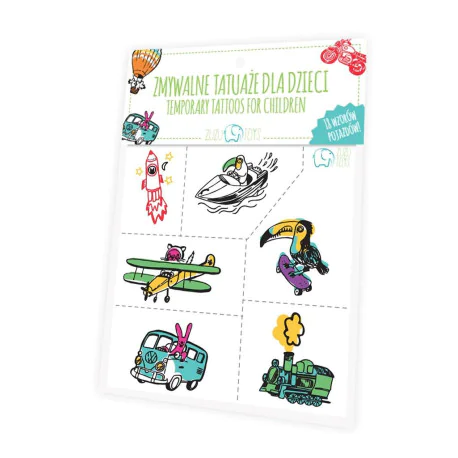 Zestaw 18 zmywalnych tatuaży dla dzieci z różnymi pojazdami.