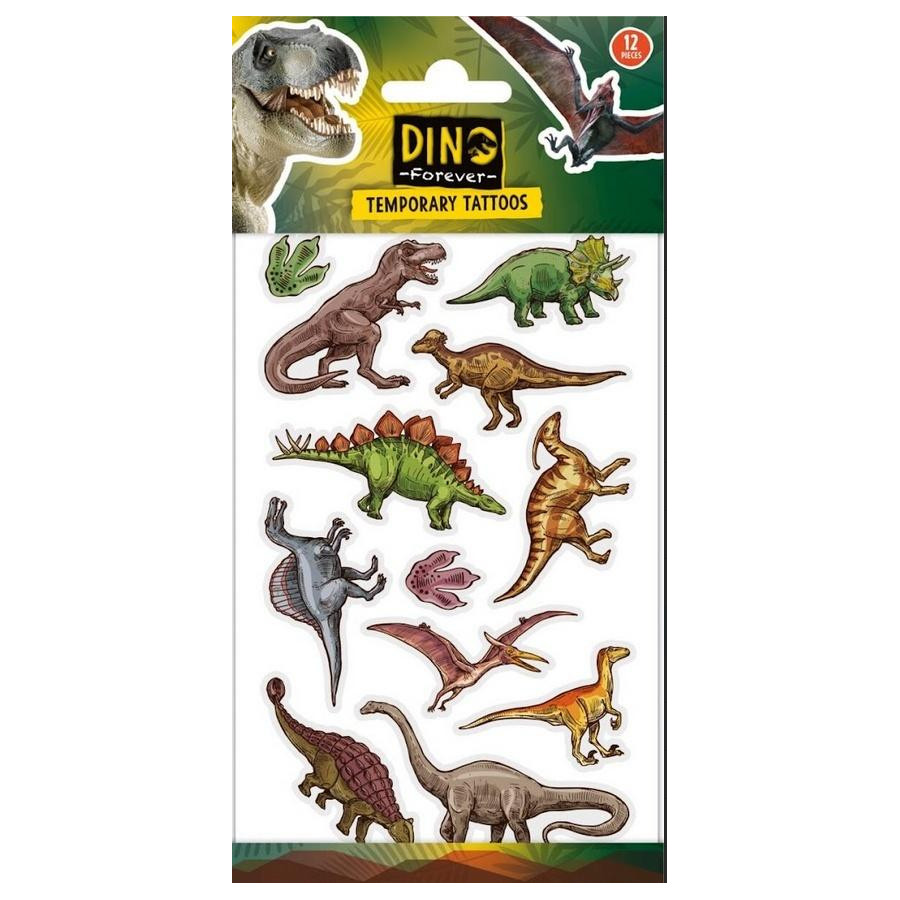 Przenieś się do prehistorycznego świata z kolorowymi tatuażami z dinozaurami! W zestawie znajdziesz różnorodne wzory przedstawiające ulubione dinozaury: T-Rexa, triceratopsa, stegozaura i wiele innych. Idealne na urodziny, zabawy tematyczne lub jako drobny prezent dla małego miłośnika dinozaurów.