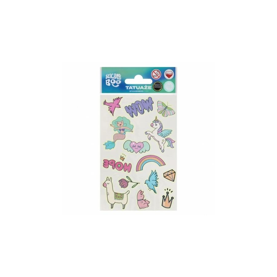 Tatuaże świecące w ciemności Girl STICKER BOO z pewnością przypadną do gustu dzieciakom, idealne do zdobienia ciała, dadzą dużo frajdy oraz satysfakcji i wiele możliwości. Łatwe w użyciu! Aby usunąć tatuaż wystarczy tylko użyć oliwki lub mydła. Zawartość zestawu: 1 arkusz z 14 tatuażami mix wzorów.