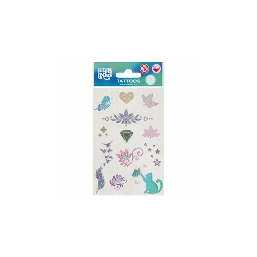 Tatuaże Brokat STICKER BOO z pewnością przypadną do gustu dzieciakom, idealne do zdobienia ciała, dadzą dużo frajdy oraz satysfakcji i wiele możliwości. Łatwe w użyciu! Aby usunąć tatuaż wystarczy tylko użyć oliwki lub mydła. Zawartość zestawu: 1 arkusz z 15 tatuażami mix wzorów.