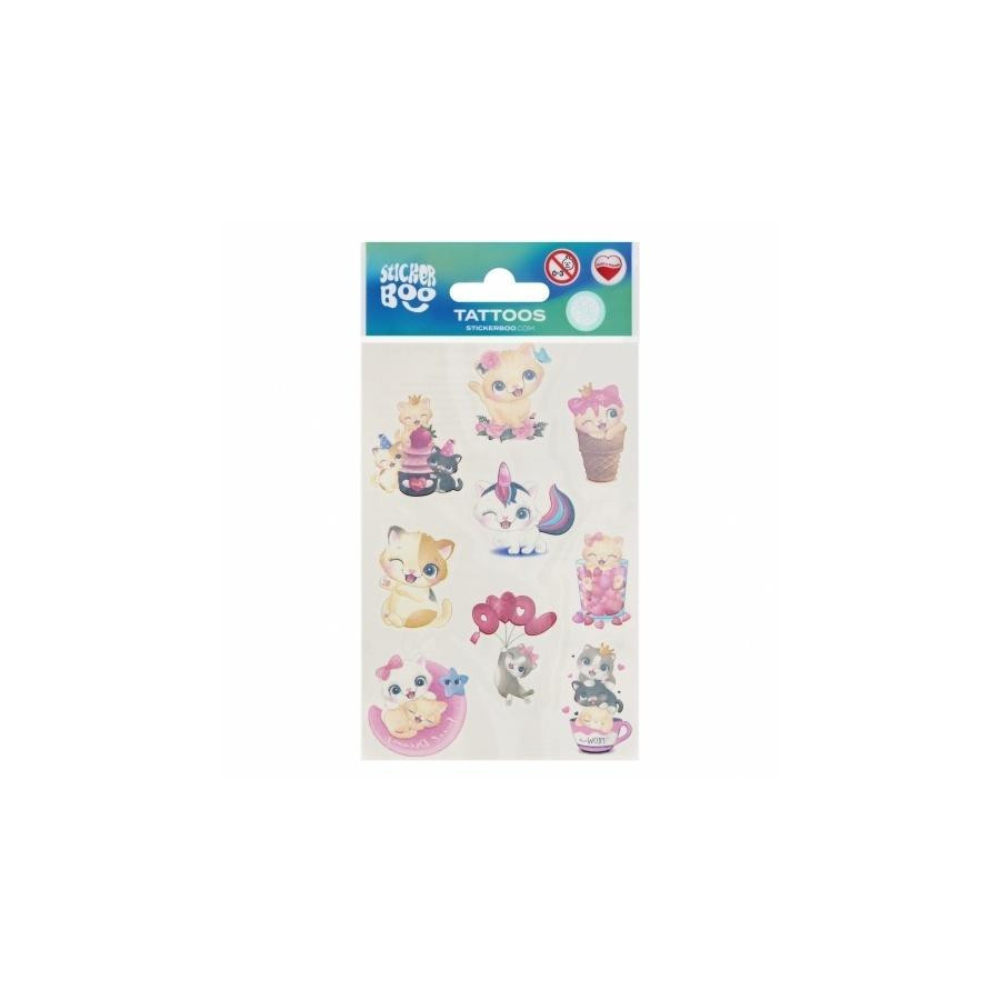 Tatuaże Kotki STICKER BOO z pewnością przypadną do gustu dzieciakom, idealne do zdobienia ciała, dadzą dużo frajdy oraz satysfakcji i wiele możliwości. Łatwe w użyciu! Aby usunąć tatuaż wystarczy tylko użyć oliwki lub mydła. Zawartość zestawu: 1 arkusz z 9 tatuażami mix wzorów.