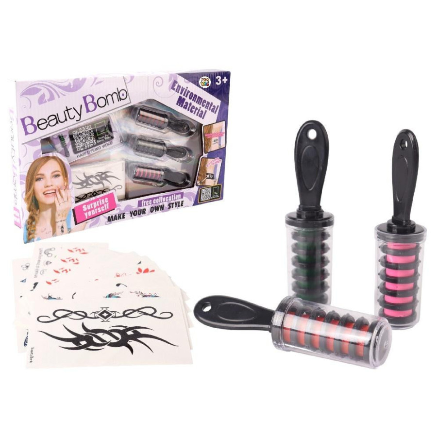 W zestawie znajdują się trzy kredy do włosów w intensywnych kolorach oraz bogaty zestaw zmywalnych tatuaży o różnych wzorach od kwiatowych i fantazyjnych po nowoczesne motywy geometryczne. Kredy są łatwe w użyciu, nie brudzą rąk i zmywają się po jednym myciu, a tatuaże można w prosty sposób usunąć wodą lub oliwką.