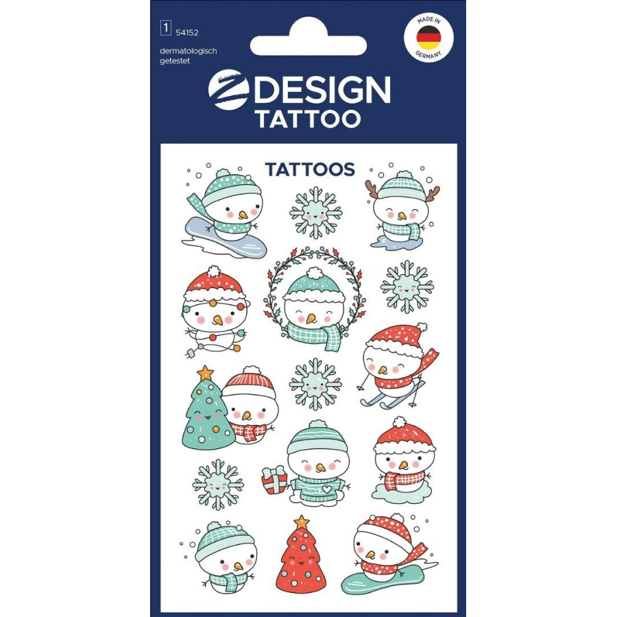 Poczuj magię świąt z tatuażami Z-Design! To idealny drobiazg do kalendarza adwentowego, prezentu od Mikołaja lub małej niespodzianki pod choinkę. Kolorowe, radosne wzory wprowadzą świąteczny nastrój i wywołają uśmiech na twarzach najmłodszych. Aplikacja tatuaży jest szybka i prosta wystarczy wyciąć wzór, przyłożyć do skóry, zwilżyć i gotowe! Bezpieczne dla dzieci, testowane dermatologicznie i wyjątkowo delikatne dla skóry zapewnią kilka dni magicznej zabawy w świątecznym stylu! Dla dzieci pozyżej 3-go roku życia