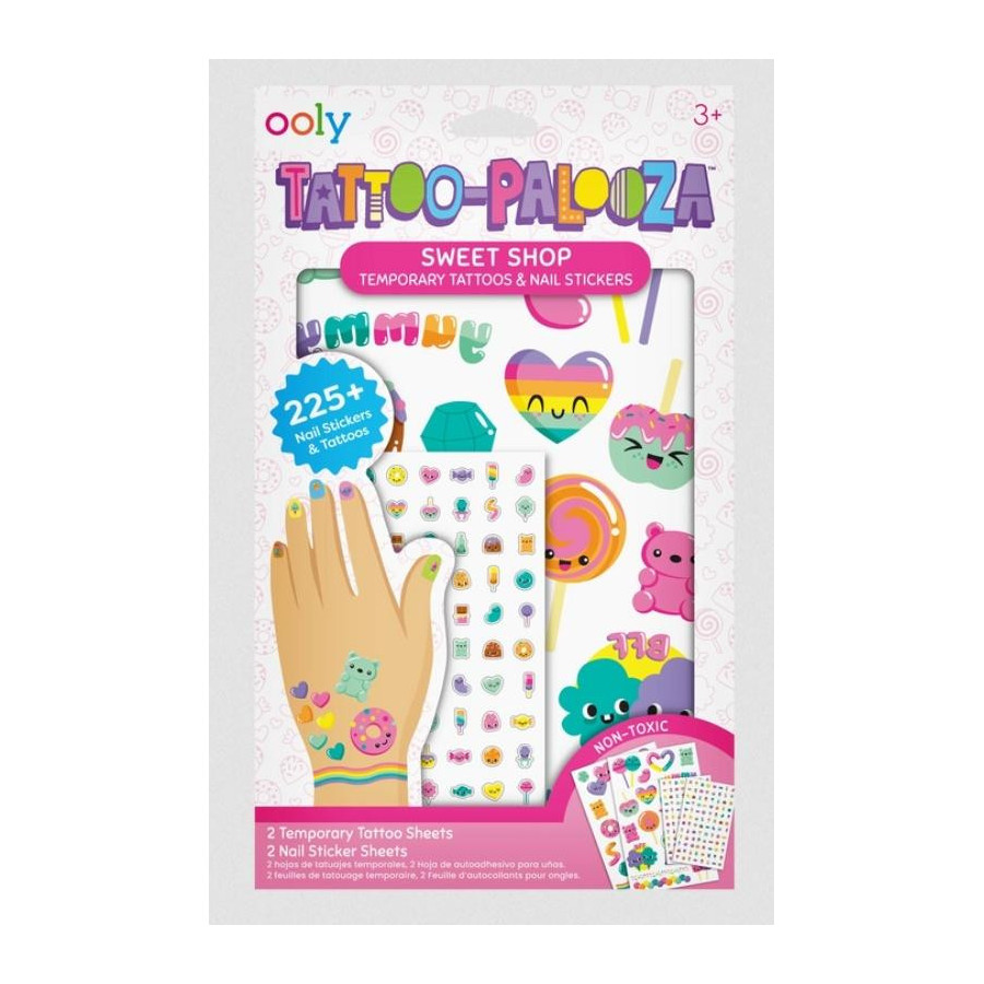 Najsłodsze tatuaże i naklejki na paznokcie, jakie stworzono! Zestaw Tattoo-Palooza Słodki Sklep pozwoli Ci pokazać swój cukierkowy styl i doda Twoim stylizacjom odrobinę pastelowej magii. W środku znajdziesz dwa arkusze tymczasowych tatuaży i dwa arkusze naklejek na paznokcie, inspirowane sklepikiem ze słodyczami. Urocze serduszka, lizaki i tęczowe motywy sprawią, że każda zabawa, przyjęcie urodzinowe czy dzień w przedszkolu zamieni się w kolorowe święto kreatywności. W zestawie znajduje się ponad 225 elementów, łatwych w aplikacji, bezpiecznych dla skóry i nietoksycznych. Tatuaże i naklejki OOLY są przeznaczone dla dzieci od trzeciego roku życia.