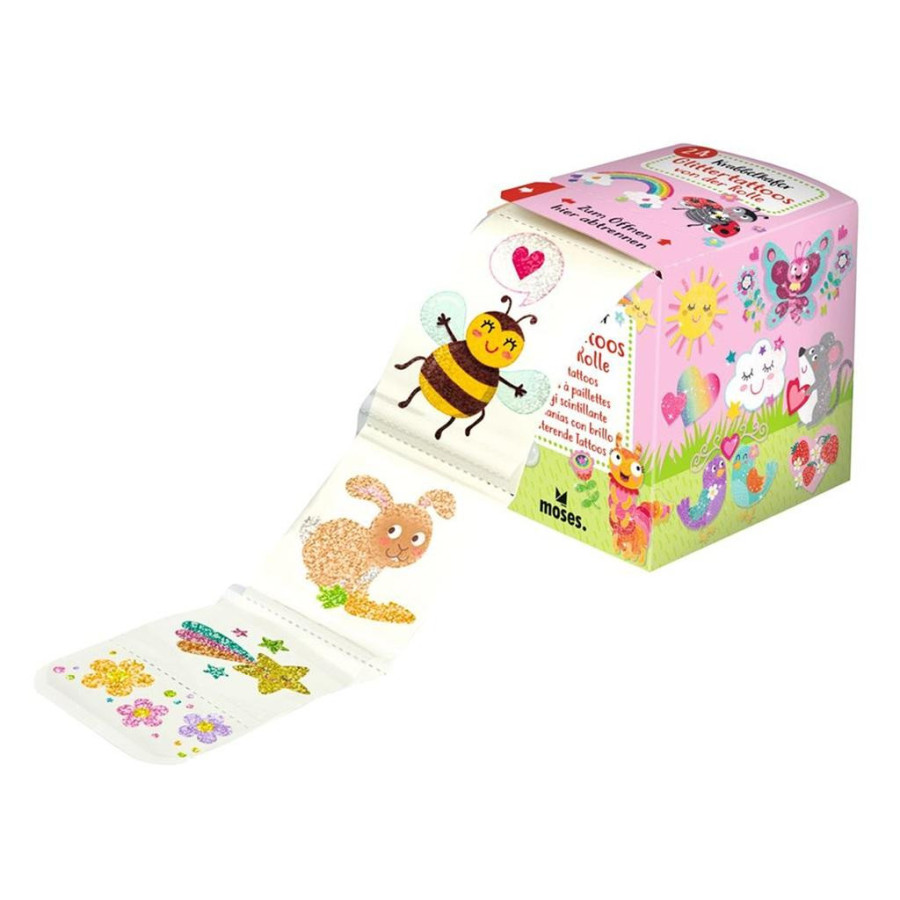 Brokatowe Tatuaże na Rolce 24 szt - Przyroda Wyjątkowe tatuaże. Dzięki 24 fajnym, samoprzylepnym tatuażom z rolki, dzieci mogą tymczasowo ozdobić swoją skórę według własnego uznania. Świetne motywy z brokatem można łatwo oderwać od rolki i przykleić na wybraną część ciała. Po pewnym czasie tatuaże same schodzą, a nowe motywy mogą zostać naklejone na ramionach, nogach lub dłoniach. Obowiązkowa pozycja dla miłośników tatuaży i świetny prezent na każdą okazję! 24 fajne, samoprzylepne tatuaże. Zawierają: słonko, chmurkę, serduszka, motylki, myszki i inne. Poszczególne tatuaże są perforowane i można je łatwo usunąć. Długość rolki: 1 metr. 100% wegańskie tzn. nie posiadają składników pochodzenia zwierzęcego, ani modyfikowanych genetycznie (GMO). Wyprodukowano w Niemczech. Testowany dermatologicznie przez Dermatest, wynik testu: bardzo dobry Posiada pieczęć gwarancyjną Dermatest. Produkty z tą pieczęcią zapewniają sprawdzoną i gwarantowaną jakość. Pieczęć aprobaty Dermatest to etykieta naukowa dla niezależnie testowanych produktów, które mają kontakt ze skórą. Wymiary opakowania: 6 cm x 4, 5 cm 6 cm.. UWAGA: Nie nadają się dla dzieci poniżej 3 roku życia. Ryzyko zadławienia. Produkty Moses są projektowane w Niemczech, ze szczególną dbałością o zrównoważony rozwój dziecka i wykonane z wysokiej jakości materiałów. Zabawki są wytwarzane zgodnie z filozofią "nauka przez zabawę", aktywnie wspierają i stymulują zarówno wyobraźnię jak i edukację dziecka.