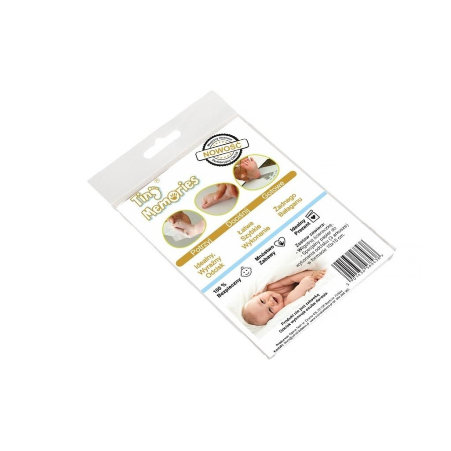 W zestawie znajduje się wilgotna ściereczka, którą zwilżamy dłoń/ stopę Dziecka, przyciskamy