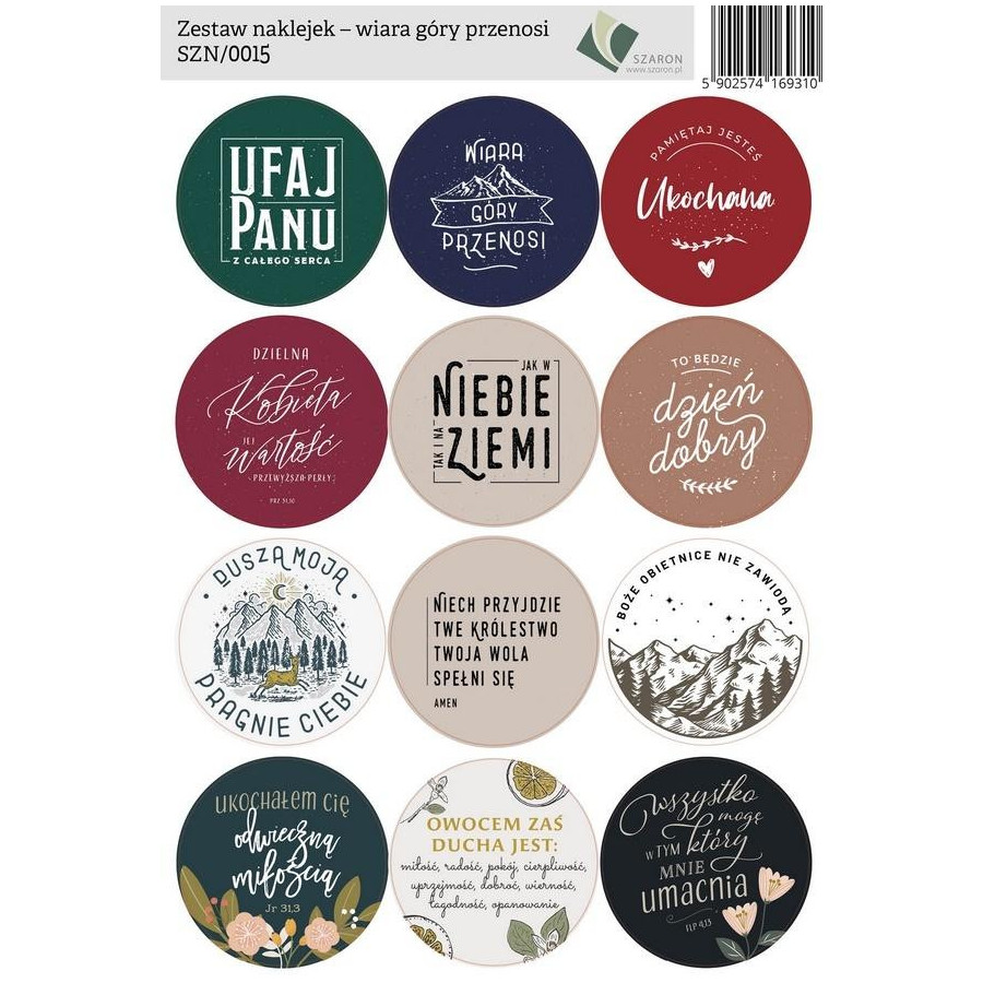 Zestaw naklejek z chrześcijańskimi hasłami w otoczeniu nasyconych barw.