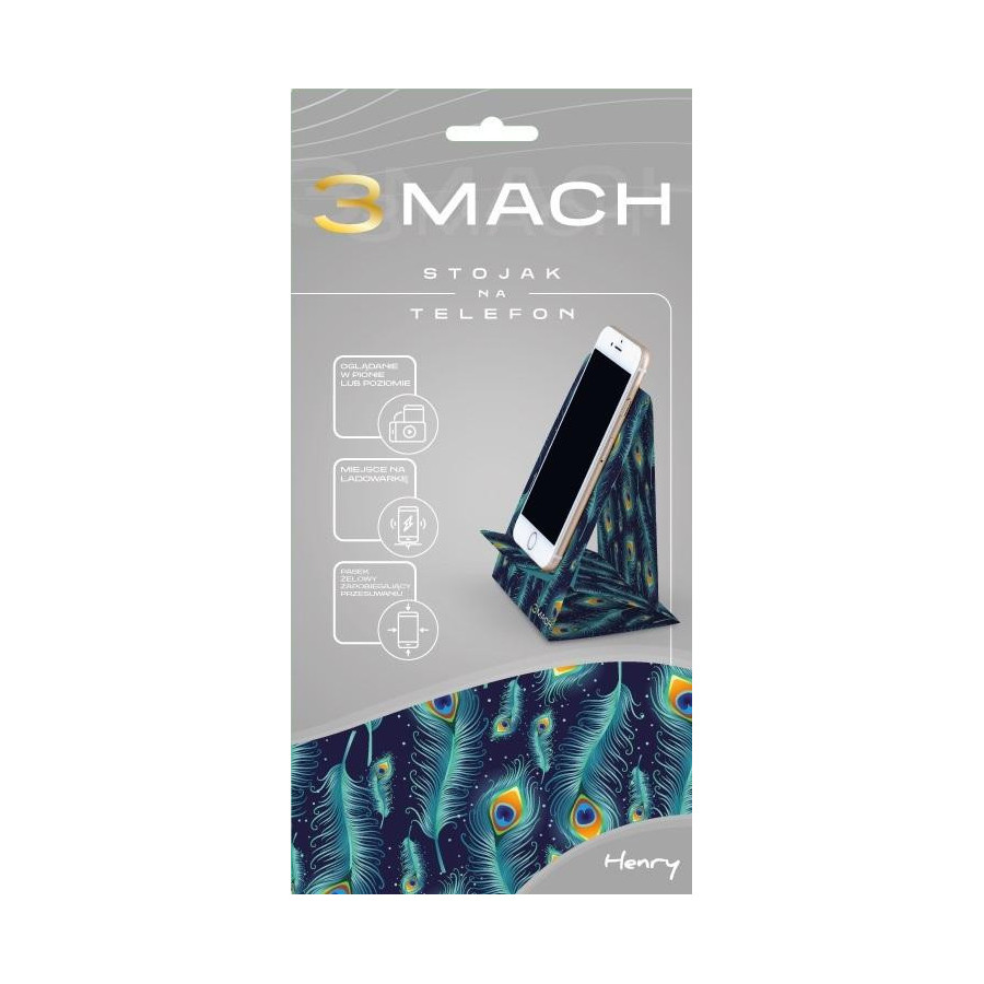 Stojak na telefon wykonany ze sztywnego kartonu. Telefon można stawiać w pionie i poziomie. Stojak pokryt matową folią soft touch zapobiegającą przesuwaniu się telefonu. Dodatkowo w zestawie znajduje się pasek żywiczny podtrzymujący telefon. Stojak do samodzielnego złożenia. Zapakowany z płaskie pudełko z otwieraniem na dole i euro zawieszką. Na odwrocie opakowania znajduje się instrukcja złożenia. Stojak posiada miejsce na podłączenie ładowarki.