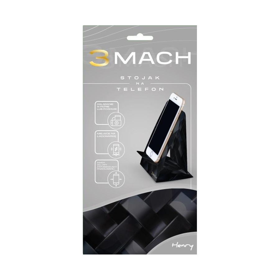 Stojak na telefon wykonany ze sztywnego kartonu. Telefon można stawiać w pionie i poziomie. Stojak pokryt matową folią soft touch zapobiegającą przesuwaniu się telefonu. Dodatkowo w zestawie znajduje się pasek żywiczny podtrzymujący telefon. Stojak do samodzielnego złożenia. Zapakowany z płaskie pudełko z otwieraniem na dole i euro zawieszką. Na odwrocie opakowania znajduje się instrukcja złożenia. Stojak posiada miejsce na podłączenie ładowarki.