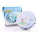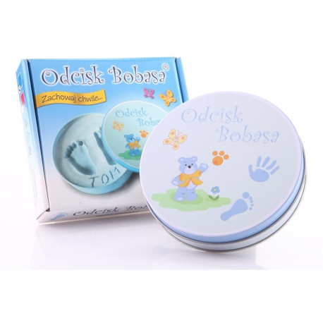 Zestaw składa się z ozdobnej puszki, w której umieszczona jest łatwa w użyciu masa. Została ona tak przygotowana, aby było można w bardzo prosty i szybki sposób przygotować ją do użycia, całkowicie samodzielnie. Wykonanie odcisku jest bardzo proste i nie zostawia żadnego bałaganu. Dodatkowo na spodzie wieczka znajduje się metryczka, która zawiera miejsce na wpisanie imienia, wieku dziecka oraz datę zrobienia odcisku. Każdy z zestawów zawiera szczegółową instrukcję obsługi, dzięki czemu wykonanie masy do odcisku nie będzie stanowiło żadnego problemu. Wykonanie pamiątkowego odcisku rączki lub stopy Malucha z pewnością będzie doskonałą zabawą dla całej rodziny. Nasz Odcisk Bobasa to pomysł na świetną zabawę.