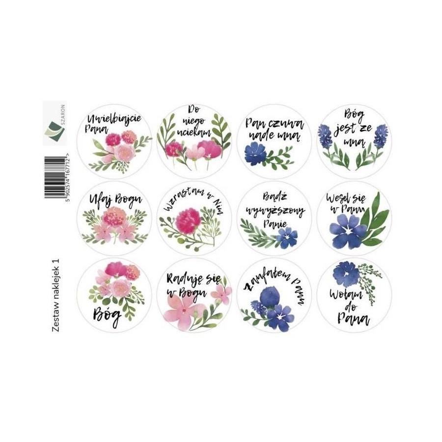 Zestaw naklejek z chrześcijańskimi hasłami w otoczeniu kolorowych