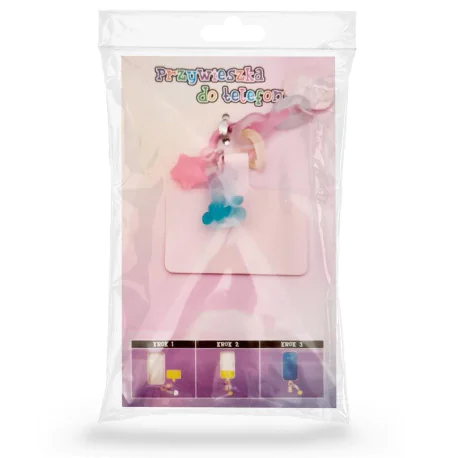 Przywieszka wyposażona jest w miękką, prostokątną wkładkę, którą umieszcza się pod obudową/etui telefonu na dole przy wejściu do ładowania. Pętelkę, którą zakończona jest prostokątna wkładka należny przełożyć przez dziurę w obudowie/etui telefonu przeznaczoną na kabel ładujący.