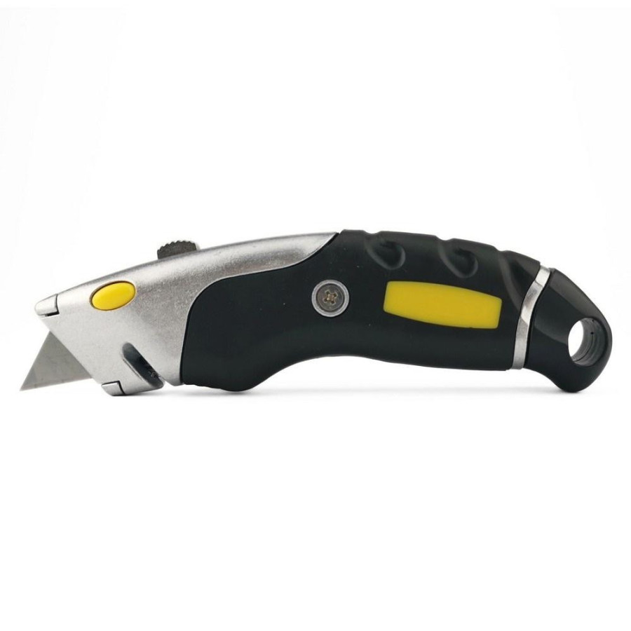 Wytrzymały i poręczny nóż wyposażony w ostrze trapezowe o rozmiarze 19 x 60 mm. Dzięki solidnej konstrukcji i ergonomicznej rękojeści zapewnia komfort pracy i precyzyjne cięcie wykładzin oraz innych materiałów. W zestawie znajdują się 3 zapasowe ostrza, co zwiększa jego funkcjonalność i trwałość. Idealny wybór do intensywnych prac wykończeniowych.