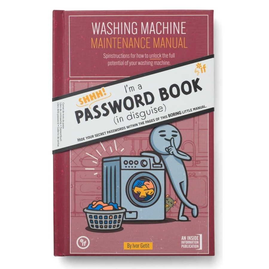 I'm a Password Book - książka, która wygląda jak nudny podręcznik pralki, ale w środku ukrywa Twoje tajne hasła. Na okładce poważne porady typu "jak naprawić wirówkę", a wewnątrz dyskretne strony na loginy i hasła. Nikt nie zajrzy - bo kto dobrowolnie czyta instrukcję pralki? Trzymaj na półce w kuchni albo w szufladzie. Bezpieczne, sprytne i z przymrużeniem oka. Koniec z książkami, na których wielkimi literami pisze "PASSWORDS"!