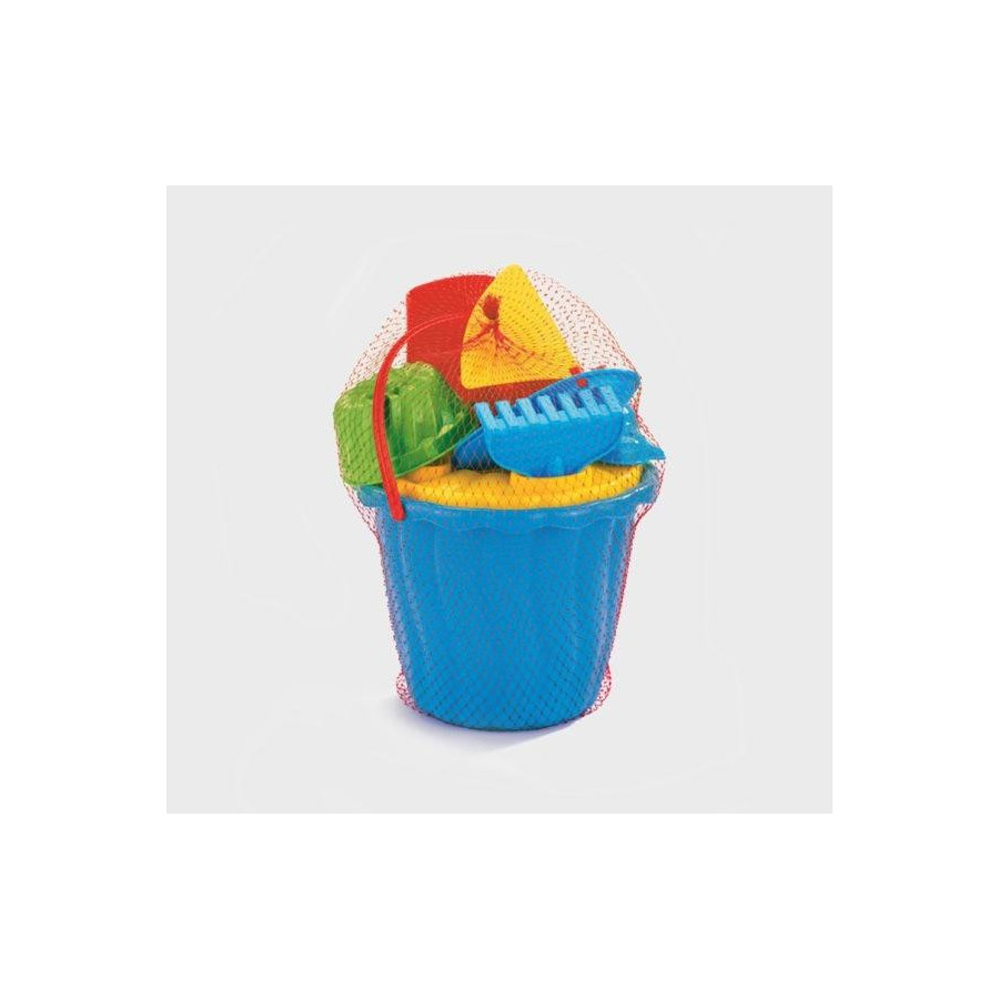 W zestawie: 8 elementów: wiaderko, sitko, łopatka, grabki, żaglówka, 3x foremki
