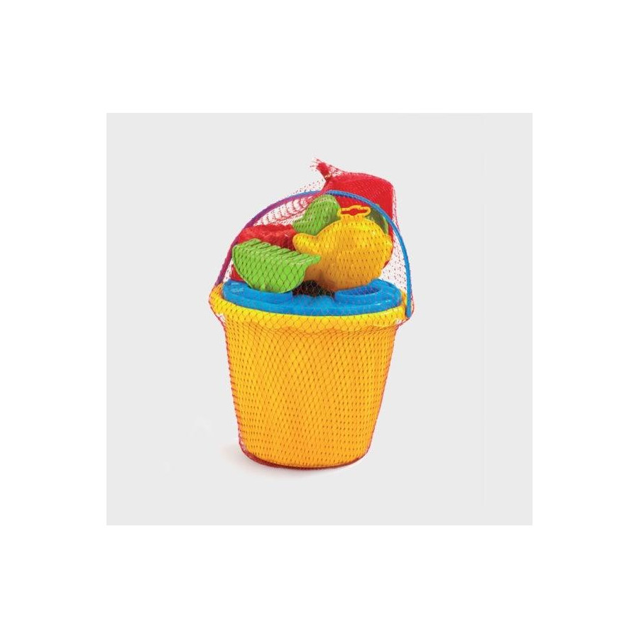 W zestawie: 7 elementów: wiaderko, sitko, grabki, łopatka, 3x foremka.