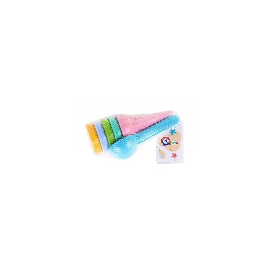 W skład "Zestawu do zabawy z piaskiem" wchodzi 5 foremek w formie "lodowego rożka" oraz łyżka do robienia gałek lodów. Zabawka wykonana jest z wysokiej jakości i bezpiecznego, bezwonnego tworzywa sztucznego.