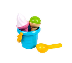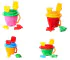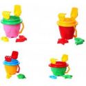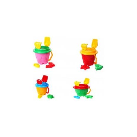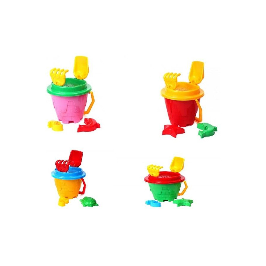 Zestaw do zabawy w piasku. Zestaw zawiera wiaderko, łopatkę, grabie, 2 foremki i sito. Kolory wysyłane są losowo.