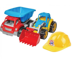 Zestaw do zabawy w piasku. Zestaw zawiera wiaderko, łopatkę, grabie, 2 foremki i sito.