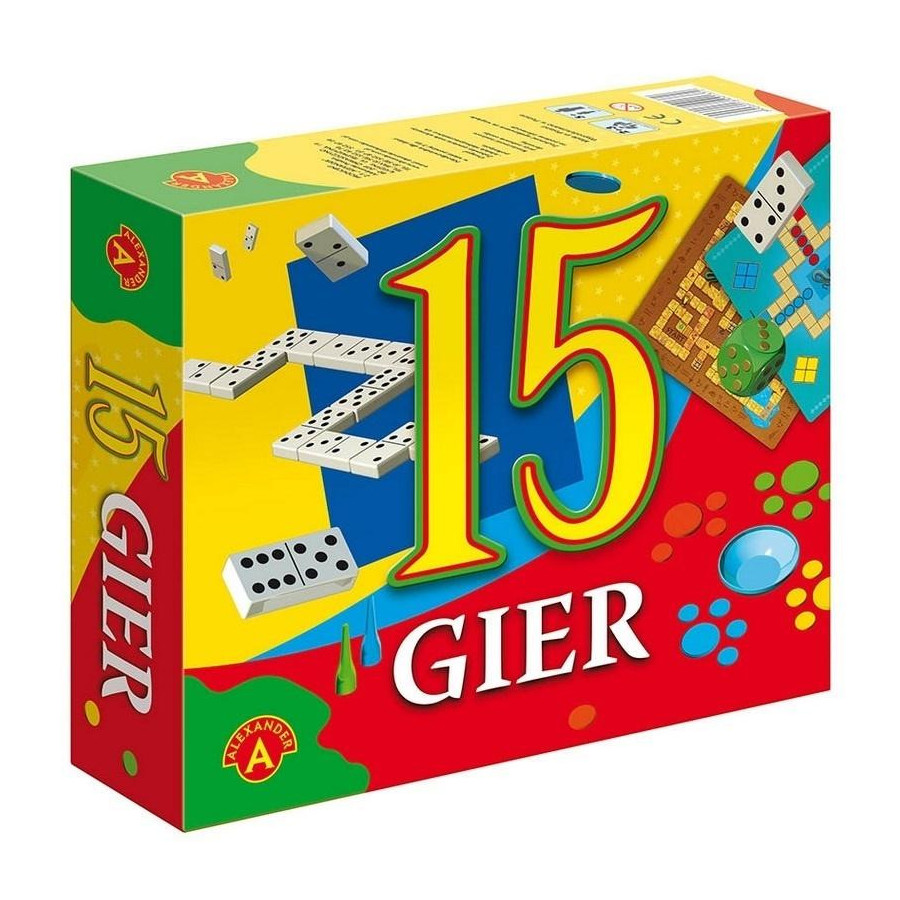 Zestaw "15 gier" - to gry proste, łatwe i popularne od dawna na całym świecie. W zestawie znajdziemy "Pchełki" wymagające zręczności i precyzji manualnej, znany i lubiany przez młodszych i starszych "Chińczyk", prezentujemy 3 jego różne wersje jak również "Domino" , które jest grą spokojną, idealną do relaksu. Prezentujemy 7 różnych wersji gry "Domino". Poza klasykami znajdą Państwo w środku również grę "Labirynt" prostą grę losową, która będzie świetną pozycją dla całej rodziny.