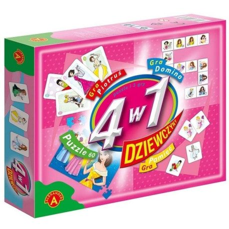 To komplet gier i puzzli o tematyce skierowanej do dziewcząt. W zestawie znajdziemy, karcianą grę "Piotruś", grę "Domino", grę "Pamięć" oraz puzzle. Załączone gry charakteryzuje różnorodny charakter, w związku z tym mogli zagrać w nie zarówno młodsi jak i starsi odbiorcy.